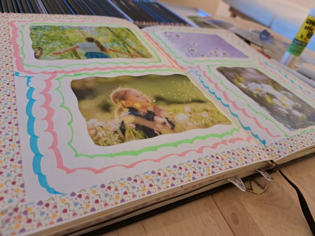 - Collage : photos, scotchs colorés, papiers texturés.