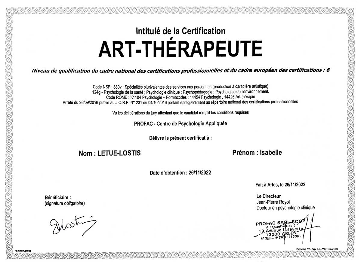 Certifications clés : Art-thérapie Contemporaine © (titre RNCP) | EFT | PTT | Tapping d’Intention.